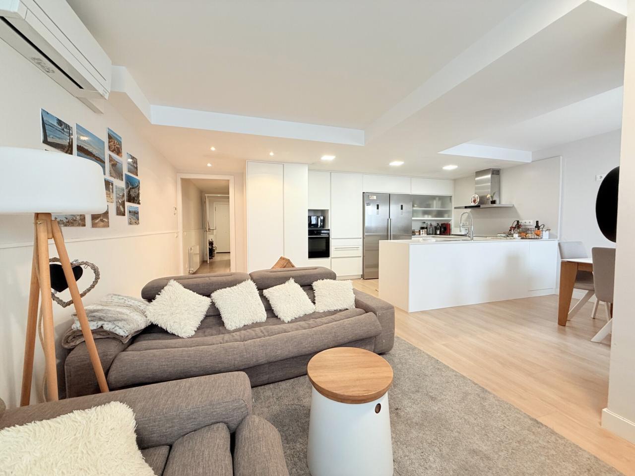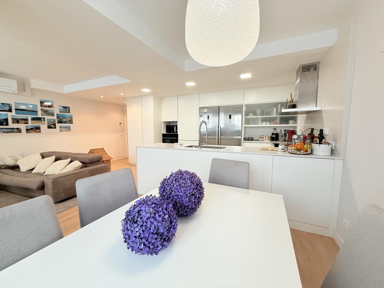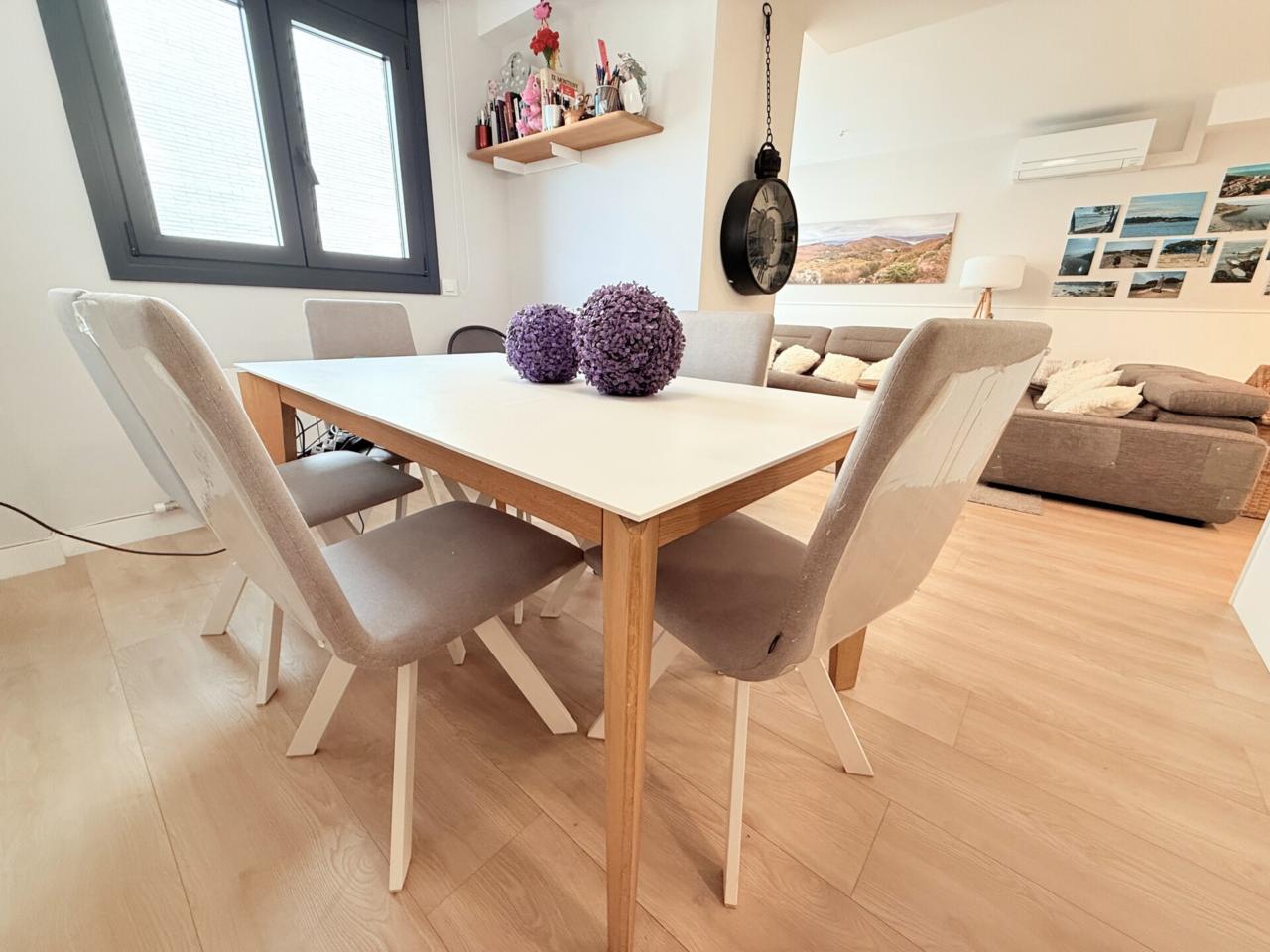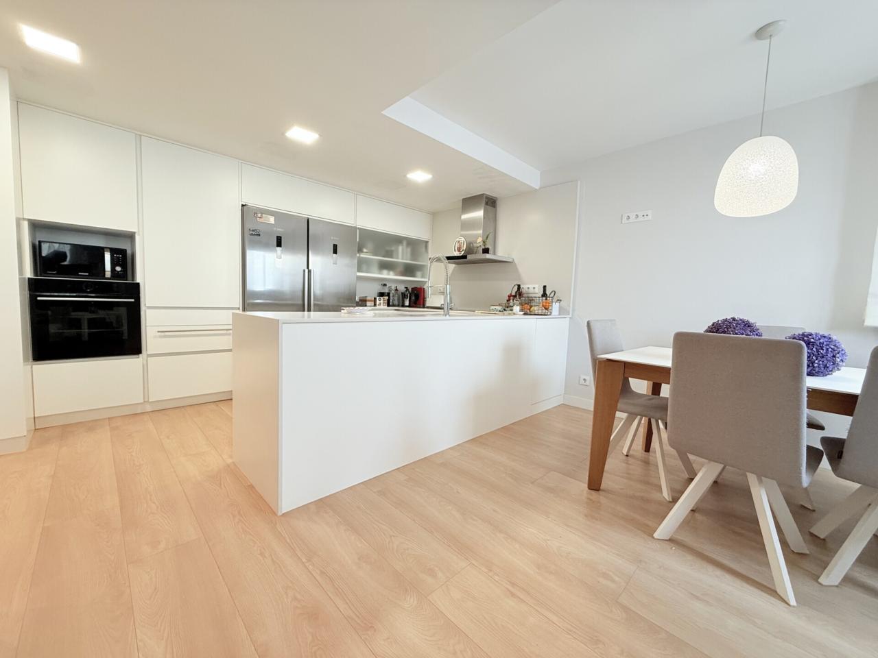 La propiedad dispone de tres habitaciones dobles, una de ellas con sala privada ideal para gimnasio, además de una habitación independiente destinada a lavandería. Cuenta con dos baños completos con platos de ducha muy amplios y un espectacular salón comedor con cocina abierta de diseño, reformada hace solo ocho meses, que aporta modernidad y una gran luminosidad a toda la vivienda. Los armarios hechos a medida maximizan el espacio y la gran terraza exterior ofrece un ambiente perfecto para disfrutar de las vistas y del aire libre. Destacan también sus nuevos cerramientos de PVC con ventanas oscilobatientes y persianas automatizadas, así como un parquet de altas prestaciones que aporta calidez, elegancia y un extra de confort en cada estancia. Para mayor comodidad, el dúplex está equipado con cinco aires acondicionados, calefacción con caldera de gas y plaza de parking para coche grande en la misma finca, un valor añadido muy difícil de encontrar en la zona.