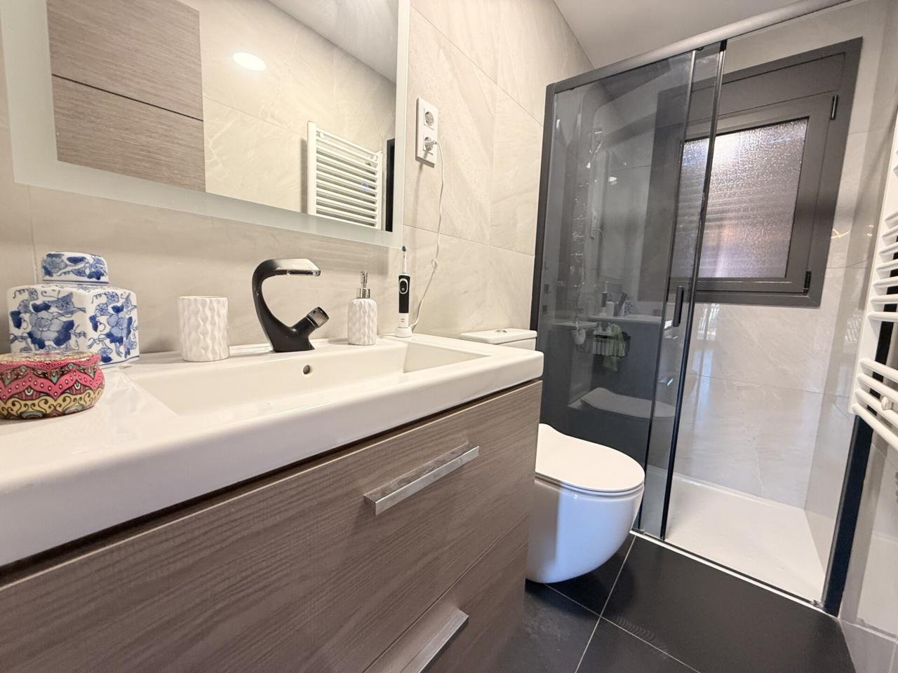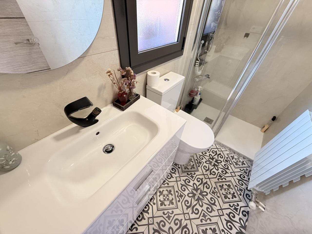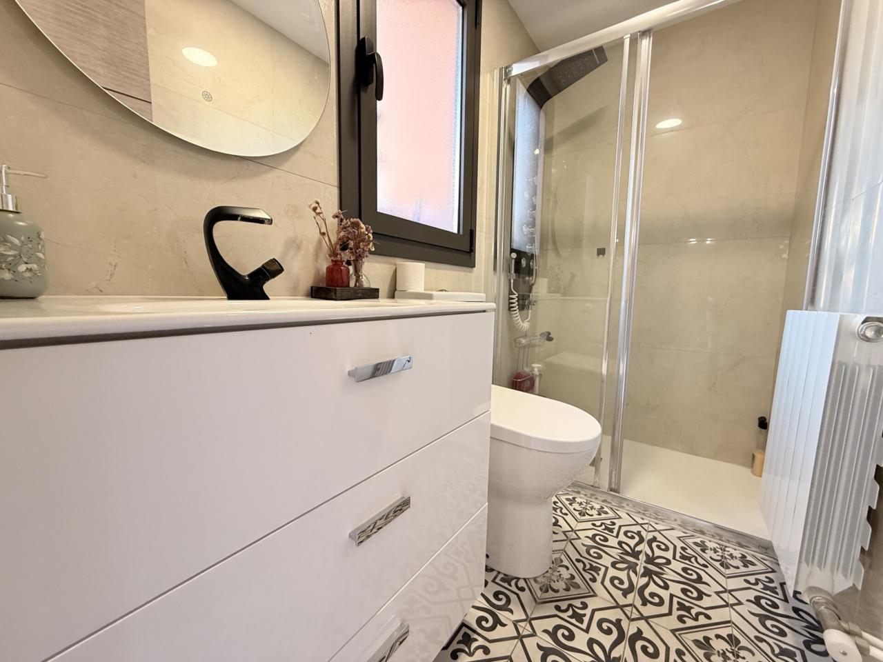 En la primera planta se distribuyen cinco habitaciones exteriores, dos de ellas con acceso directo a un balcón frontal que aporta luminosidad. La cocina integrada en el salón crea un ambiente práctico y acogedor, y los tres baños completos garantizan el confort del día a día. La vivienda cuenta con calefacción de gas y aire acondicionado para disfrutar de una temperatura ideal en cualquier época del año.